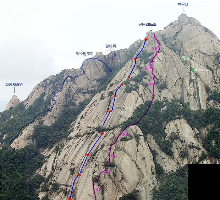 9피치 종료 후 북쪽 쇠말뚝 따라 올라가면 백운대 정상. 탈출로: 6피치 전망대에서 우측 내리막 → 등산로, 또는 8피치 후 9피치 우측으로 우회하여 백운대 정상.