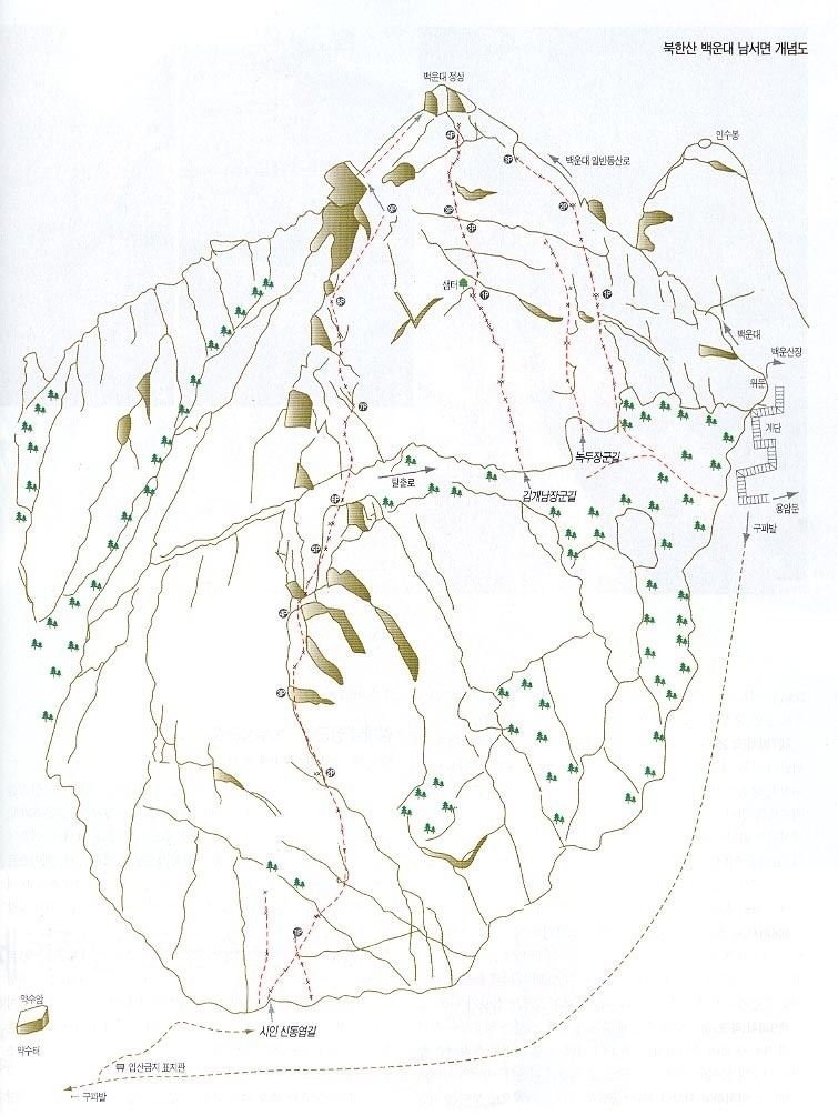 백운산장 → 백운봉암문 → 구파발 방향 하강 → 약수암 가기 전 남벽 우측으로 돌아서면 출발지점. 약 20분. 구파발에서는 약 1시간.
